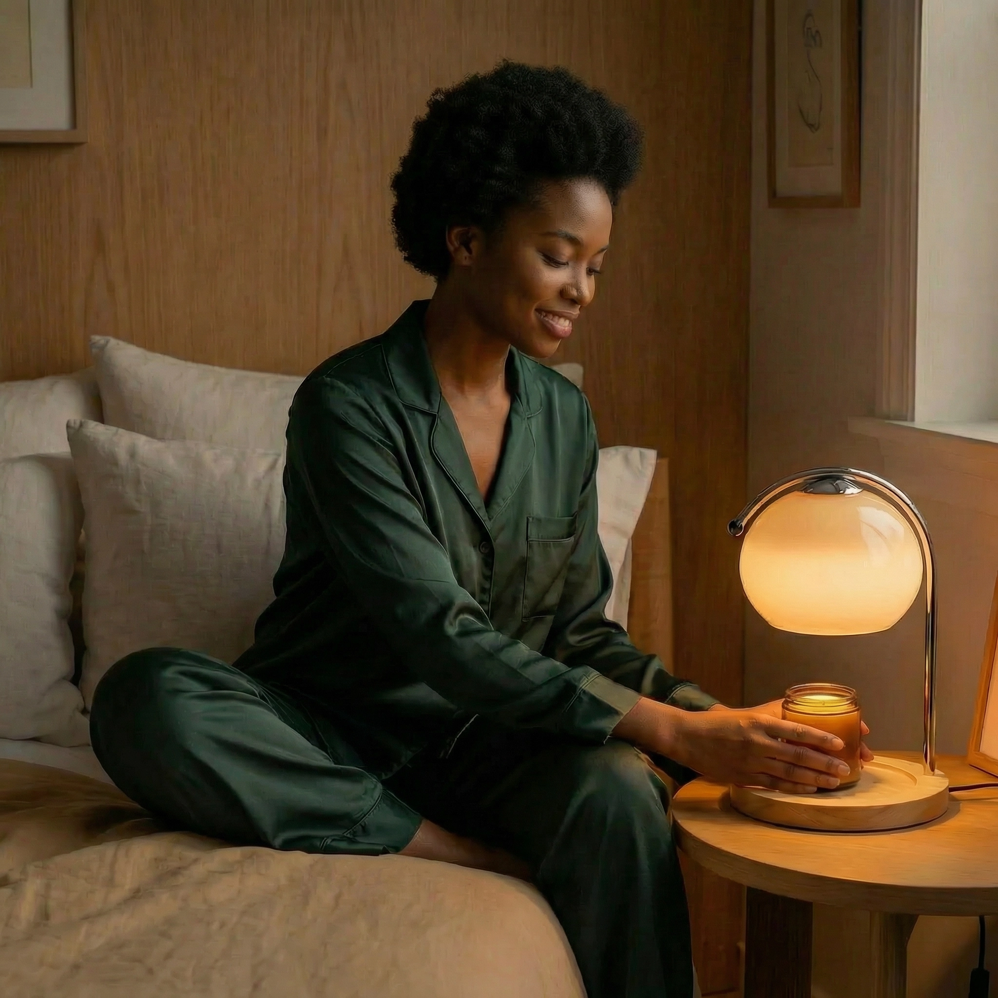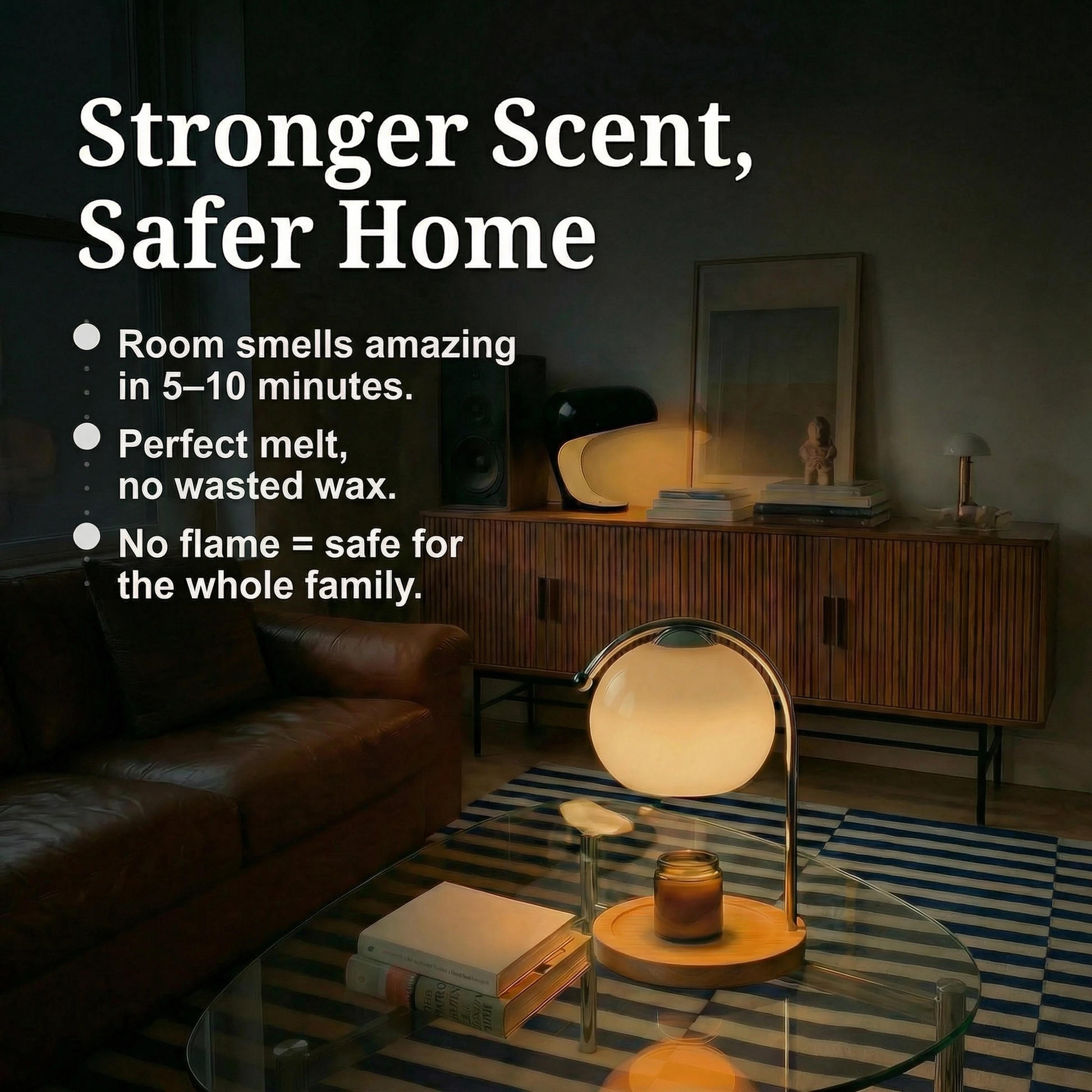 Our Meva lamps changes everything. The 50W bulb gently warms the entire top surface, melting wax evenly from edge to edge. Only the fragrance is released; the wax stays behind. Your candles last up to 5x longer, smell stronger, and there's zero smoke, soot, or open flame to worry about.