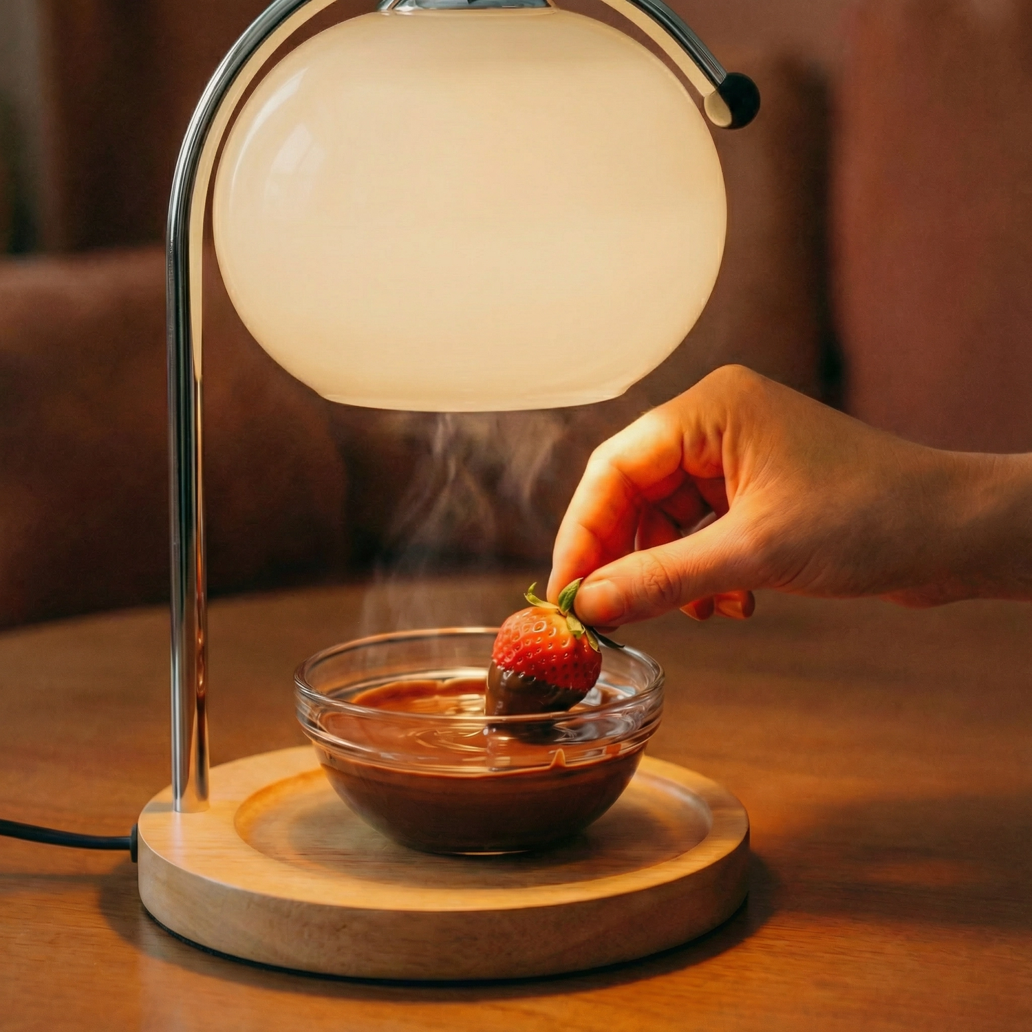 Forget the double boiler setup and constant stirring. Place a small bowl of chocolate (or cheese) on the wood, turn on the Meva lamp, and watch it melt to a perfect consistency in 5-10 minutes. The gentle, even heat keeps it smooth and warm without burning.